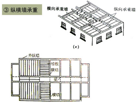 凡由纵向墙和横向墙共同承受楼板、屋顶荷载的结构布置称纵横墙(混合)承重方案。该方案房间布置较灵活,建筑物的刚度亦较好。混合承重方案多用于开间、进深尺寸较大且房间类型较多的建筑和平面复杂的建筑中,前者如教学楼、住宅等建筑。