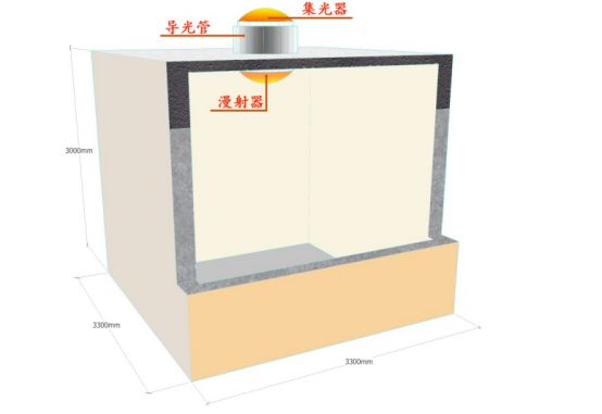 在导光管建筑理想模型建立时考虑住宅这一功能在我国占有的比例比较大,故此选取了3300㎜(开间)×3300㎜(进深)×3000㎜(层高)的住宅(卧室或起居厅)这一理想模型(见图3),具体项目需结合项目自身的具体尺寸进行计算。本文对采光照度等相关参数依据相关规范中住宅这一功能进行选取。